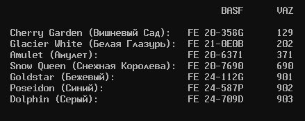 Название изображения: номера цветов красок ШН