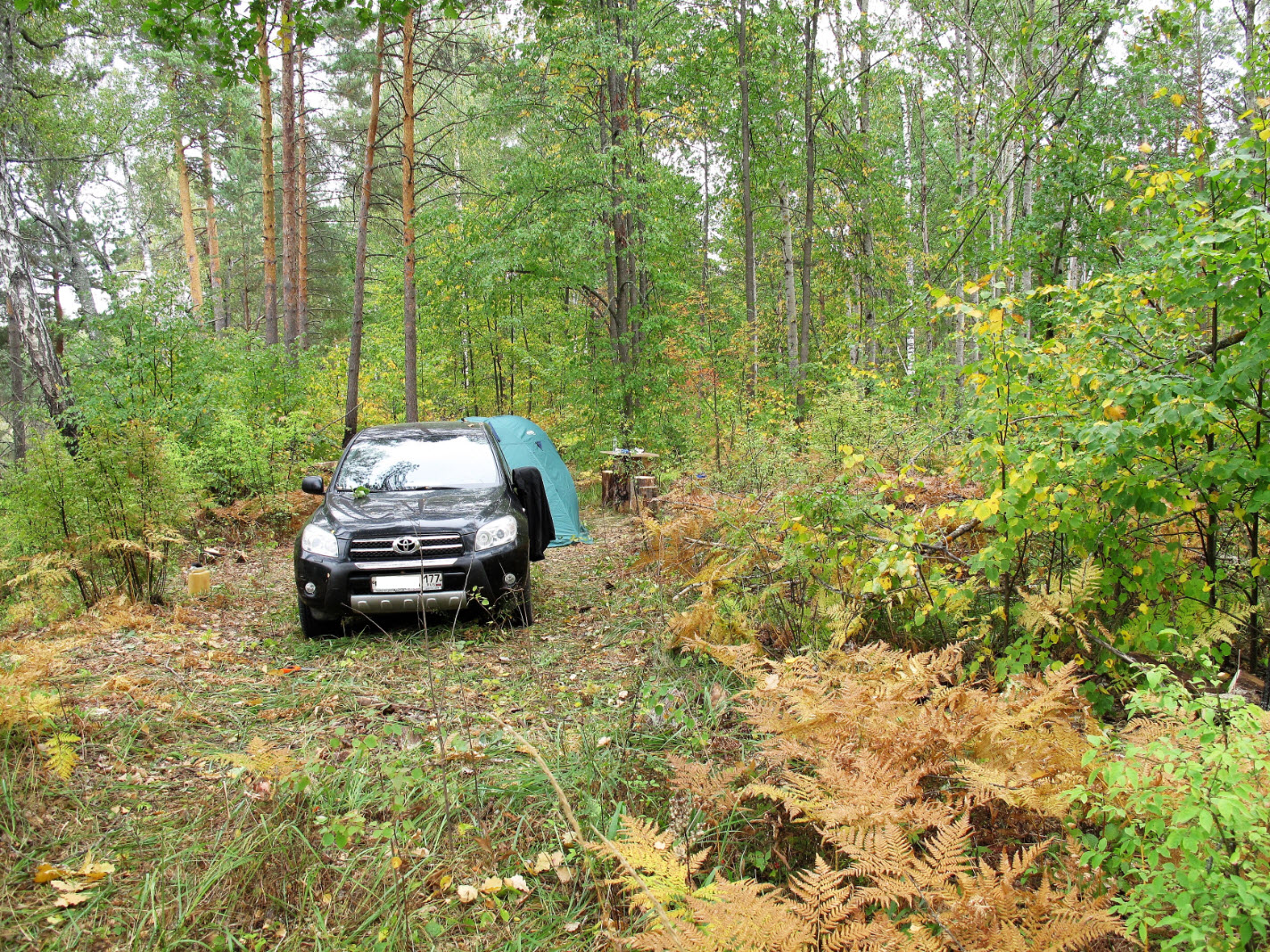 Остановились здесь, фактически, прямо на старой дороге, шедшей по правому берегу, на затяжном прямолинейном участке реки. Дорога идет и ниже, но здесь показалось наиболее уютным и удобный спуск к воде с довольно-таки высокого 2-ярусного берега. Всё пришлось оборудовать самим: "столик", "стулья", скамьи напилили из ствола засохшей после пожара вековой сосны, прокопали ступеньки к воде, установили причал для лодки. Попутно свалили несколько сухостойных подгоревших стволов, их ветви сожгли постепенно в костре |